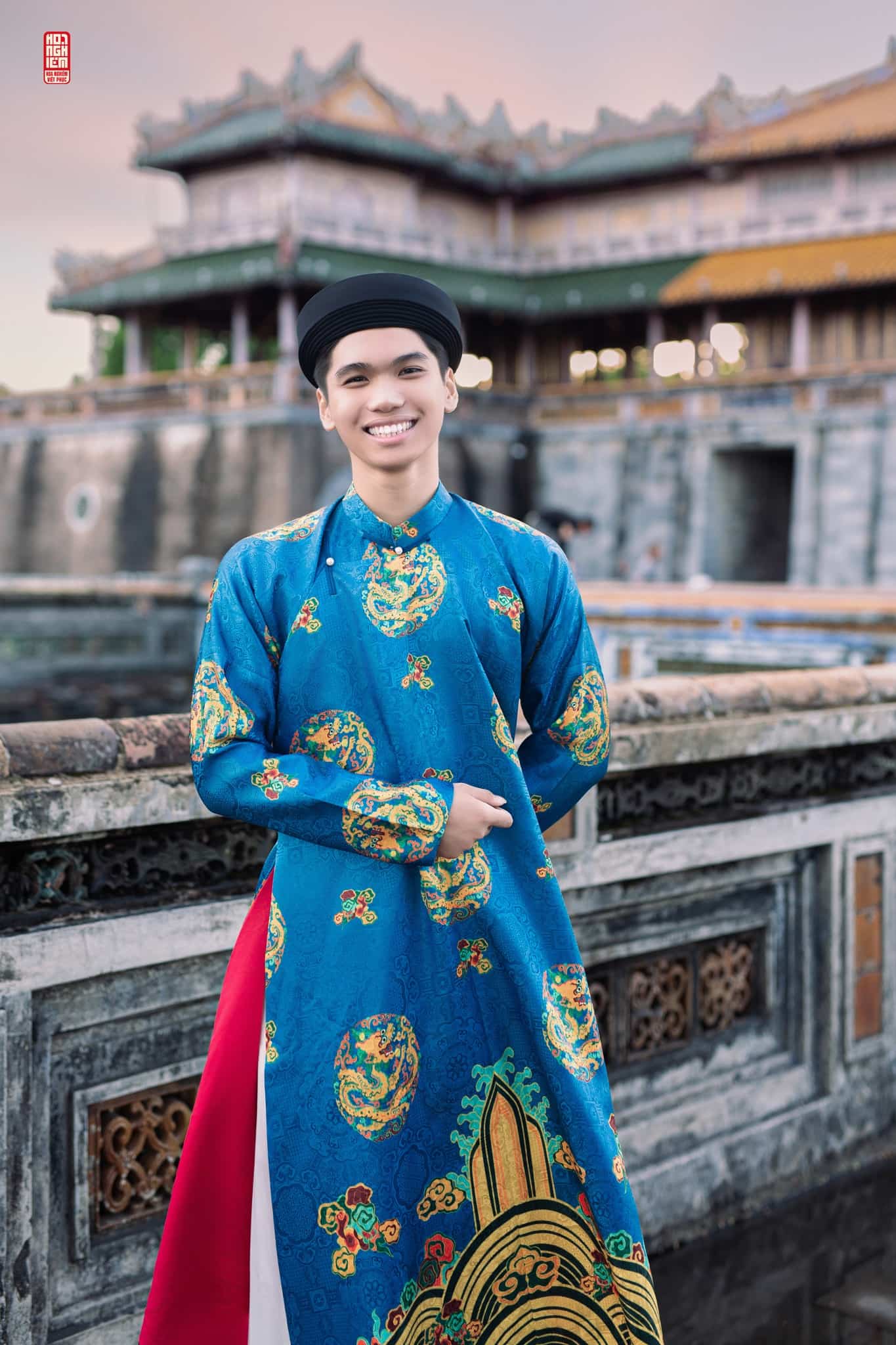 - Áo Nhật Bình (Nữ): Được thiết kế với form dáng chuẩn triều Nguyễn, phần cổ áo thêu họa tiết đối xứng kết hợp đính kết cườm tinh xảo. Điểm nhấn là hình ảnh chim Phượng tung cánh giữa mây ngũ sắc, tượng trưng cho sự quyền quý và rạng rỡ của người phụ nữ.
