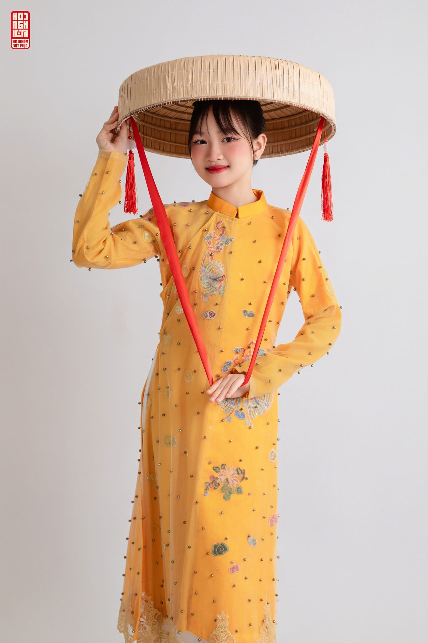 Ngũ Thân tay chẽn màu vàng đính hạt thêu họa tiết nổi – vẻ đẹp thanh quý của Việt phục truyền thống